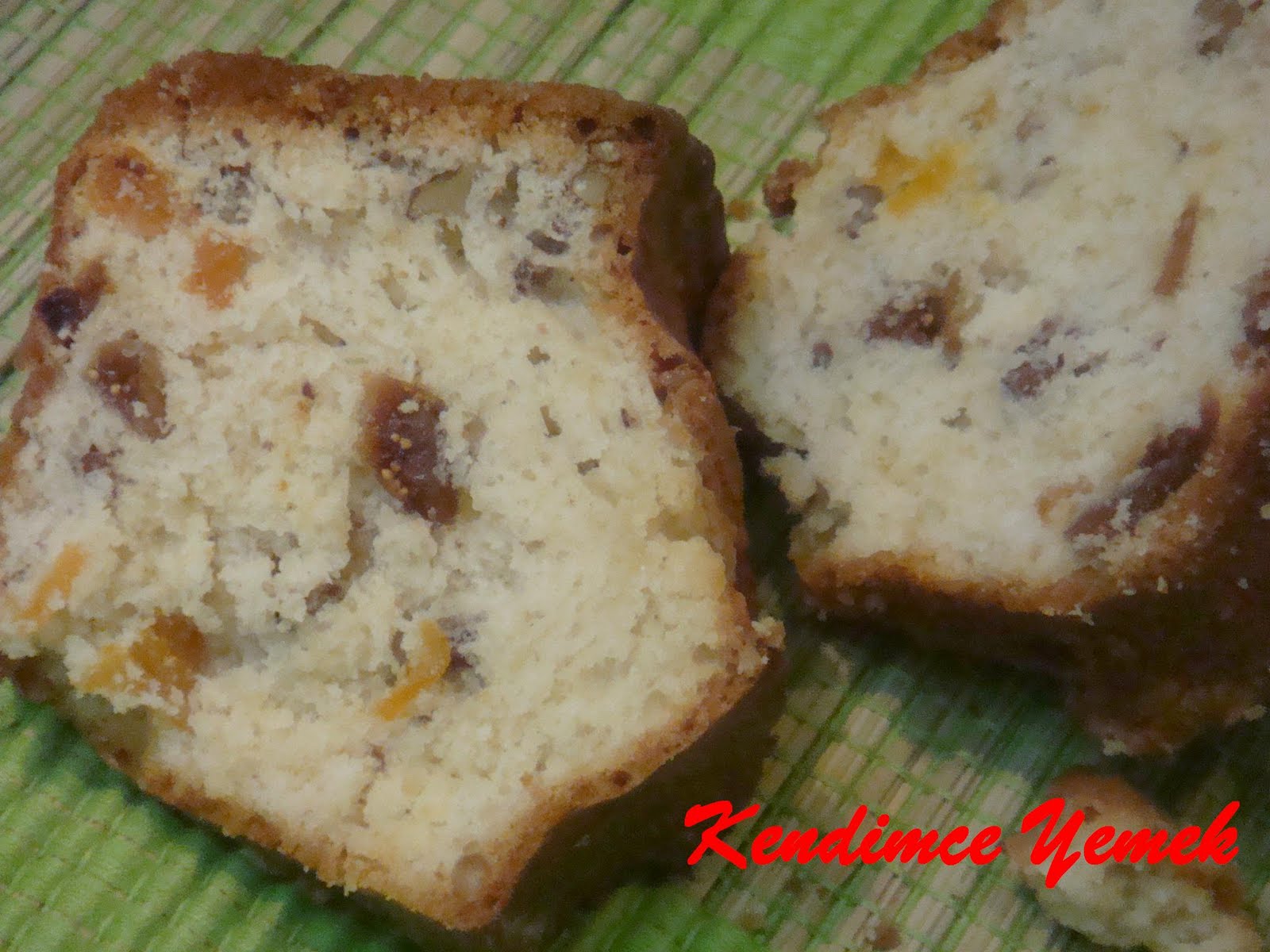 Başlayın sulu malzemelerinizi krema kıvamında karıştırdığınız yumurta şeker karışımına ilave etmeye.Bir su bardağı sıvıyağ,bir su bardağı süt karıştırmaya devam.Arada çayınızı da soğutmadan yudumlayın bu arada eğer sıkıntılıysanız bulutların biraz dağılmaya başladığını hissedeceksiniz.Eğer olaya neşeli başladıysanız radyonuzda sevdiğiniz bir şarkıyı bulun açın radyonun sesini hatta yüksek sesle çalan şarkıya eşlik edin keyifle işe devam.Bir paket kabartma tozu,bir paket vanilya 3 su bardağı un ilave edin karıştırmaya ara vermeden bütün malzemeleri bir bütün halinde çırpmaya devam edin.Eğer mutfağa girip çıkıp çaktırmadan doğranmış kayısı ve incirleri yiyen bir bebeniz yoksa malzemeler koyduğunuz yerde durmaya devam ediyorsa harcınızın içine ilave edip cevizleri de ekledikten s0nra yağladığınız ve çok hafif unladığınız kalıbınıza harcınızı boşaltın.170 derecede ısıtılmış fırınınıza kalıbınızı yerleştirin.
