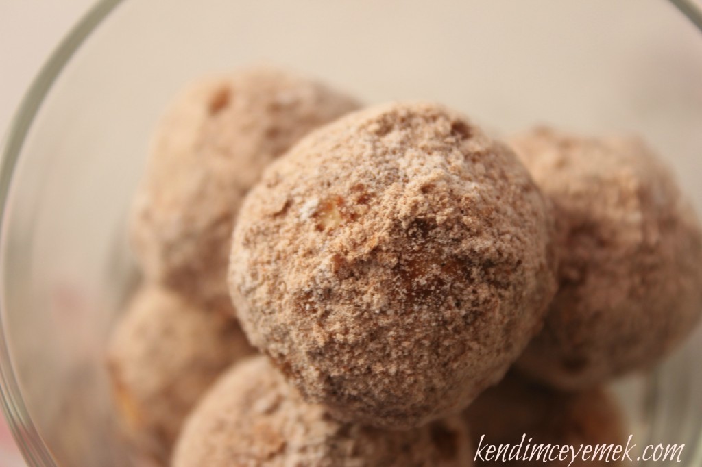 Yağlı kağıt serdiğiniz tepsiye,küçük ceviz parçası kadar yuvarlaklar yapıp,sıralayın.160 derecede çok kızarmasına izin vermeden pişirin.Geniş bir tepsi içine,bolca pudra şekeri ve tarçın koyup bunu bir kaşık yardımı ile karıştırın.